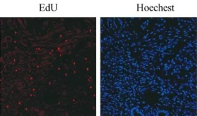EDU detection method: a substance similar to thymidine is used instead of T to infiltrate the replicating DNA molecule during cell proliferation, and through EDU and Apollo®The specific reaction of fluorescent dyes to detect DNA replication activity, which accurately reflects the detection of cell proliferation.